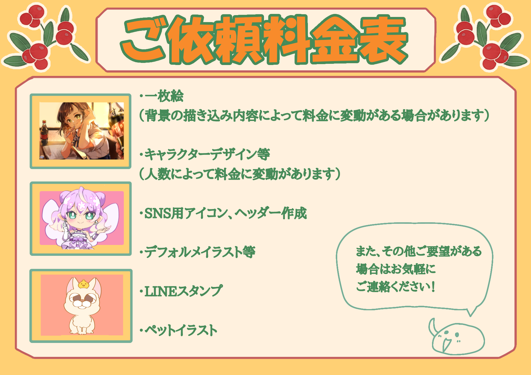 - 制作したイラストは当方のSNSやポートフォリオに実績として掲載いたします。完全非公開や一定期間の非公開をご要望の方はご相談ください。